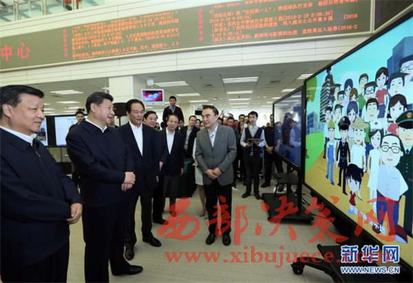 2016年2月19日,中共中央總書記、國家主席、中央軍委主席習近平在北京主持召開黨的新聞輿論工作座談會,并到中央新聞單位調研。這是習近平在新華社觀看新聞信息產品展示。新華社記者蘭紅光攝