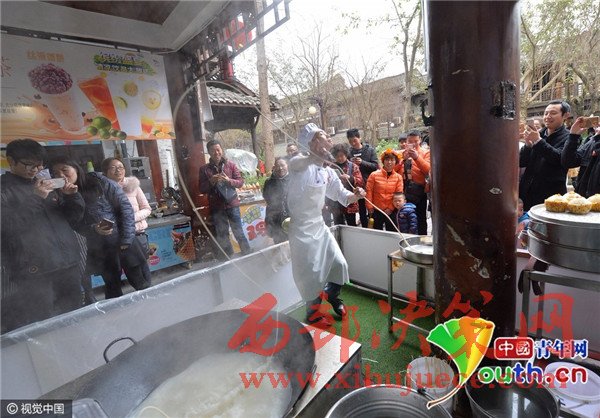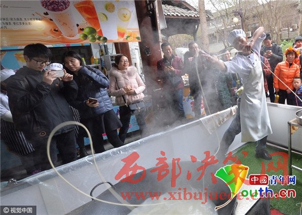 2月22日,田波如往常般工作,面館門口聚集了里外三層的圍觀者。正在拉面的田波,表演的正是網(wǎng)絡上廣為流傳的那個版本。妖嬈的動作,嫵媚的表情,配上黃齡的那首《癢》,整個畫面活色生香。