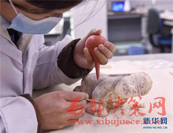 2月27日,成都考古研究所文物保護與修復(fù)中心工作人員在對出土文物進行清理