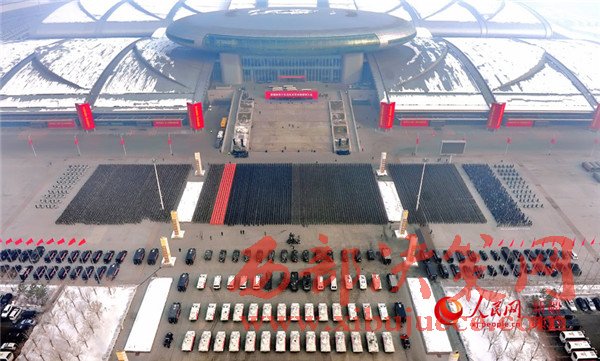 新疆國際會展中心廣場上,1萬余名武警官兵、公安民警、民兵預(yù)備役人員等各維穩(wěn)力量緊握鋼槍盾牌、整齊列隊挺立,直升機在空中盤旋,一輛輛軍車、裝甲車、摩托車列隊待發(fā)。