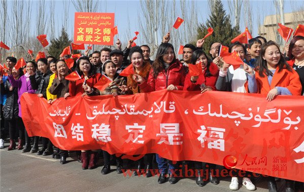 “聽黨指揮、能打勝仗、作風(fēng)優(yōu)良!”參加誓師大會的全體維穩(wěn)力量聲震長空,有力宣示了全疆各族干部群眾堅定不移貫徹社會穩(wěn)定和長治久安總目標(biāo)的堅定決心,展示了各維穩(wěn)力量忠誠勇敢、無堅不摧、敢打必勝的強大戰(zhàn)斗力,彰顯出新疆各族人民同仇敵愾、堅決戰(zhàn)勝暴恐分子的共同意愿。