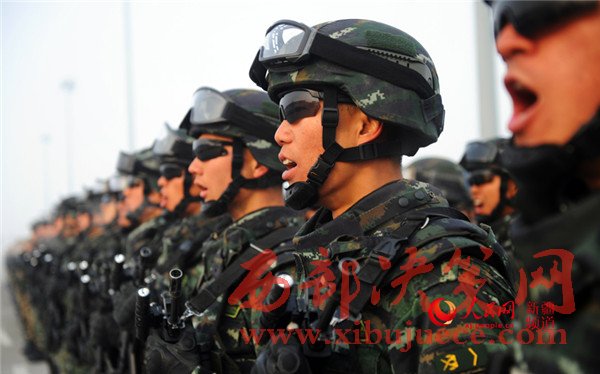 參加喀什地區(qū)反恐維穩(wěn)誓師大會的武警官兵高喊口號奮勇向前。