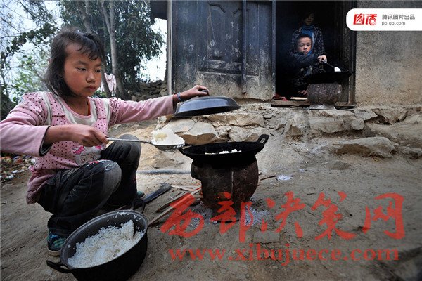 圖為2011年3月31日,在貴州羅甸縣班仁鄉(xiāng),學(xué)生在每學(xué)期開學(xué)的時候,除了背書包去上學(xué)以外,還要帶著爐灶和鍋碗瓢盆等。包括一年級學(xué)生在內(nèi),在學(xué)校他們每天必須自己生火做飯。