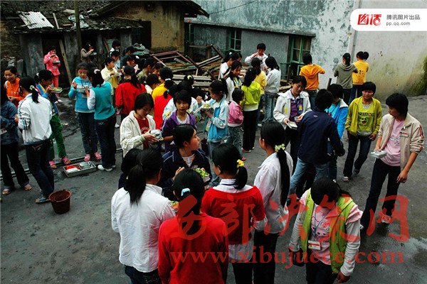 圖為2007年4月29日,福建龍巖市上杭縣蛟洋中學(xué),由于餐桌有限,大部分學(xué)生只能在室外站著用餐。