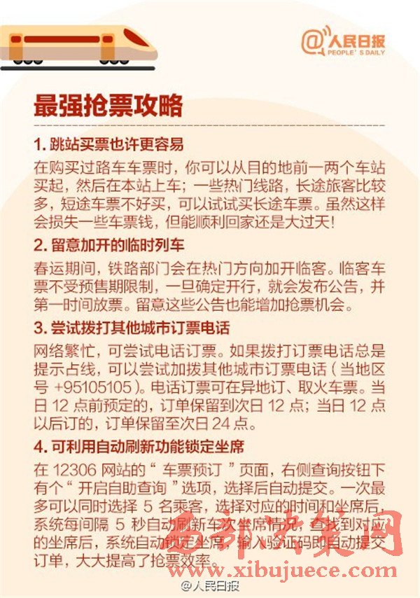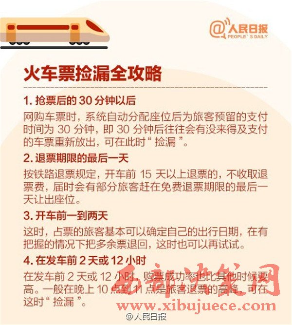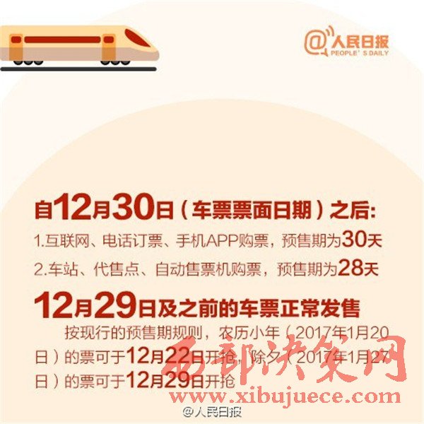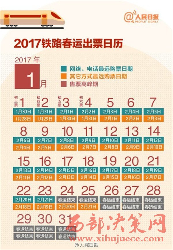 2017年春運(yùn)從1月13日至2月21日,是近5年來開始時間最早的春運(yùn),你做好搶票準(zhǔn)備了嗎?目前火車票預(yù)售期30天,除夕當(dāng)天的票12月29日開搶,網(wǎng)絡(luò)購票須在30分鐘內(nèi)付款,發(fā)車前2天或12小時可“撿漏”。