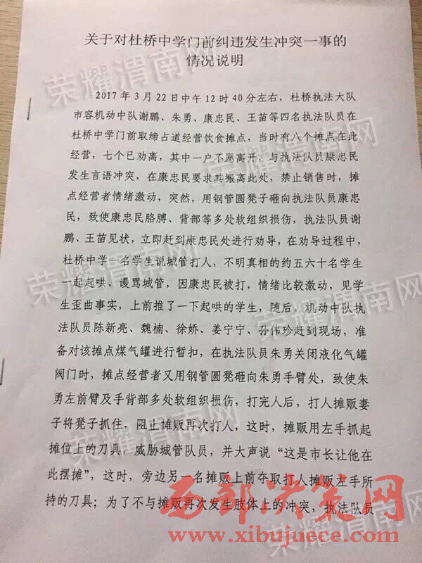 當晚6點以后,涉事執(zhí)法隊員所屬執(zhí)法大隊杜橋執(zhí)法大隊書面回復便在網(wǎng)絡中被網(wǎng)友們不斷的轉載。據(jù)該回復稱:2017年3月22日中午12時40分左右,杜橋執(zhí)法大隊市容機動中隊謝鵬、朱勇、康忠民、王苗等4名執(zhí)法隊員在杜橋中學門前取締占道經(jīng)營飲食攤點,當時有八個攤點在此經(jīng)營,七個已勸離,其中一戶不愿離開,與執(zhí)法隊員康忠民發(fā)生言語沖突,在康忠民要求其搬離此處,禁止銷售時,攤點經(jīng)營者情緒激動,突然,用鋼管圓凳子砸向執(zhí)法隊員康忠民,致使康忠民胳膊、背部等多處軟組織損傷,執(zhí)法隊員謝鵬、王苗等見狀,立即趕到康忠民處進行勸導,在勸導過程中,杜橋中學一名學生說城管打人,不明真相的約五六十名學生一起起哄、謾罵城管,因康忠民被打,情緒比較激動,見學生歪曲事實,上前推了一下起哄的學生,隨后,機動中隊執(zhí)法隊員朱勇、陳新亮、魏楠、徐嬌、姜寧寧、孫偉珍趕到現(xiàn)場,準備對該攤點煤氣罐進行暫扣,在執(zhí)法隊員朱勇關閉液化氣罐閥門時,攤點經(jīng)營者用鋼管圓凳砸向朱勇手臂處,致使朱勇左前臂及手背部多處軟組織損傷,打完人后,打人攤販妻子將凳子抓住,阻止攤販再次打人,這時,攤販用左手抓起攤位上的刀具,威脅城管隊員,并大聲說“這是市長讓他在此擺攤”,這時,旁邊另一名攤販上前奪取打人攤販左手所持的刀具;為了不與攤販再次發(fā)生肢體上的沖突,執(zhí)法隊員王苗撥打110報警,在警察到現(xiàn)場之前,攤販與執(zhí)法隊員一直僵持;警察趕到現(xiàn)場后,與商販進行交涉,這時,商販亮出了精神病證,警察看后,把執(zhí)法隊員叫到一旁,告知執(zhí)法隊員此人有精神??;鑒于這種情況,執(zhí)法隊員依據(jù)法律法規(guī),將該攤點煤氣罐進行暫扣,并將暫扣單交于打人商販的妻子,隨后,警察要求執(zhí)法隊員撤離現(xiàn)場,對當事人進行教育。