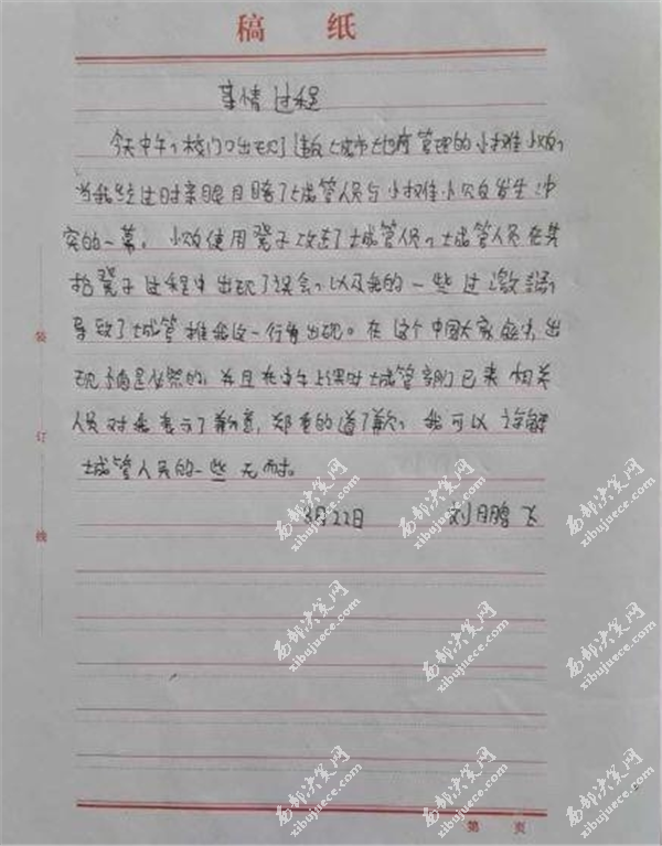 同時,該回復還出現(xiàn)了學生和兩名執(zhí)法人員面對面的照片,在回復的最后有該學生手寫的事情過程。據(jù)該學生手寫過程稱,當時學生親眼目睹了城管與小販發(fā)生沖突的一幕,既然是親眼目睹,為何會有視頻中的“隨便打人”一說嗎?可想而知孩子在寫這份事情過程的時候是什么樣的心情。