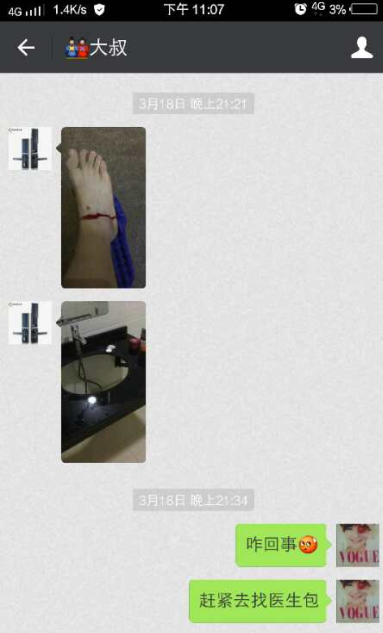 隨后,馬女士給本刊人員發(fā)來了她與老公的微信對話截圖和老公給她發(fā)來腳受傷的照片。通過微信截圖和照片顯示死者是在3月18日晚上21時21分受的傷,同衛(wèi)計局所說當(dāng)晚9時40多不到十點鐘的時間是相吻合的,但令人意想不到的是一個外傷竟然不到半小時就奪走了秦先生的性命。