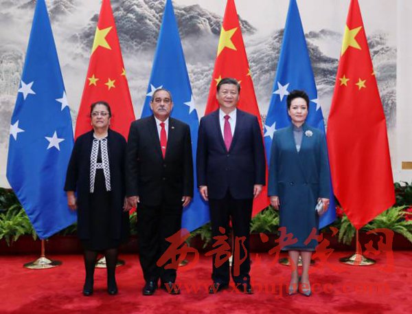 3月27日,國(guó)家主席習(xí)近平在北京人民大會(huì)堂同密克羅尼西亞聯(lián)邦總統(tǒng)克里斯琴舉行會(huì)談。會(huì)談前,習(xí)近平在人民大會(huì)堂東門(mén)外廣場(chǎng)為克里斯琴舉行歡迎儀式。這是習(xí)近平和夫人彭麗媛同克里斯琴總統(tǒng)夫婦合影。