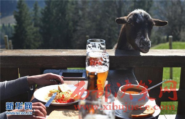3月27日,在德國南部塞格附近的一家戶外餐館,一只山羊向正在用餐的客人討要食物。
