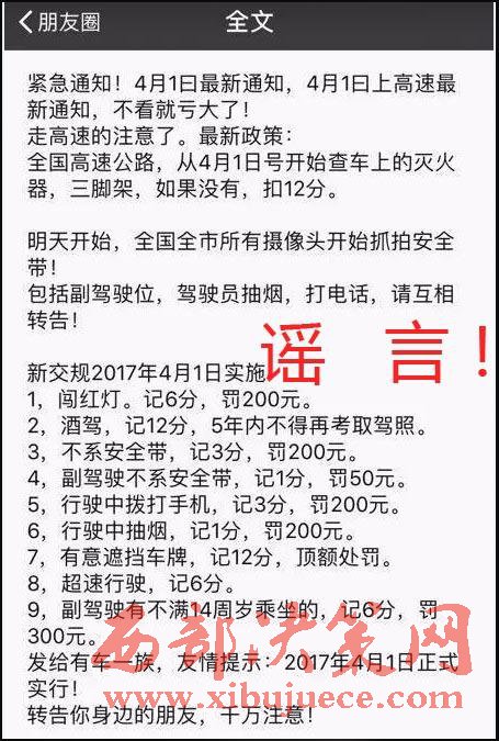 1.【謠言】“4月1日起高速上查車,沒有滅火器扣12分;同時(shí)新交規(guī)開始實(shí)施……”近日,這則關(guān)于“4月1日起新交通法規(guī)將實(shí)行”的消息出現(xiàn)在多地網(wǎng)民的微信朋友圈中。在網(wǎng)傳的消息中,“不系安全帶記3分、罰200元,副駕駛不系安全帶記1分、罰50元,行駛中撥打手機(jī)記3分、罰200元,行駛中抽煙記1分、罰200元……”種種條款讓網(wǎng)民頗為緊張。