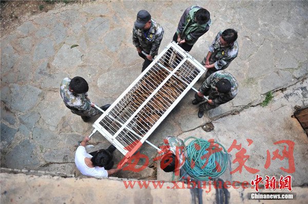 工作人員合力抬老虎。