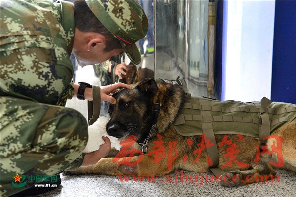 戰(zhàn)前,訓(xùn)導(dǎo)員在為警犬“道海”按摩放松。