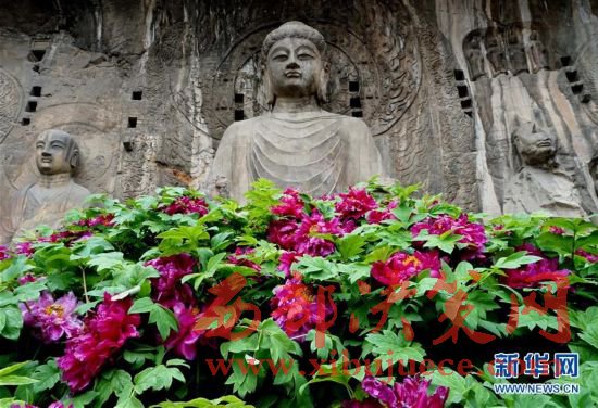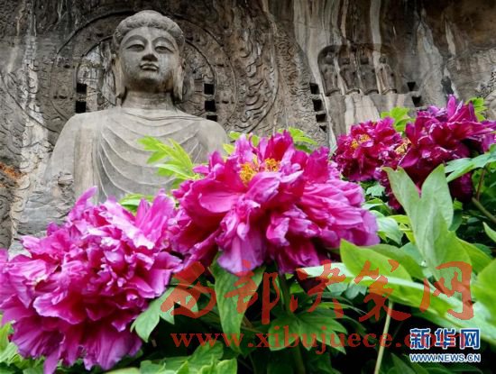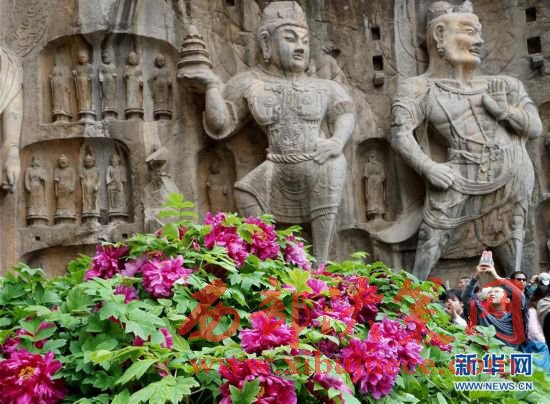 目前正值洛陽牡丹的盛花期,洛陽龍門石窟景區(qū)內的近萬株牡丹爭奇斗艷,與古老的石刻佛像共同構成獨特的風景。