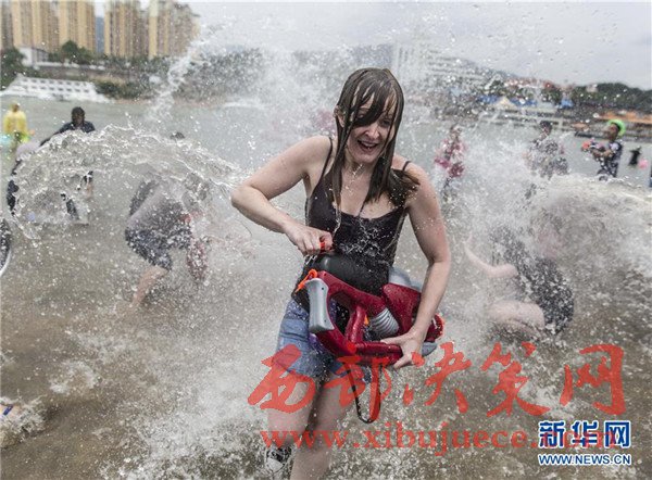 4月15日,一名外國游客在西雙版納景洪潑水廣場參加潑水狂歡。