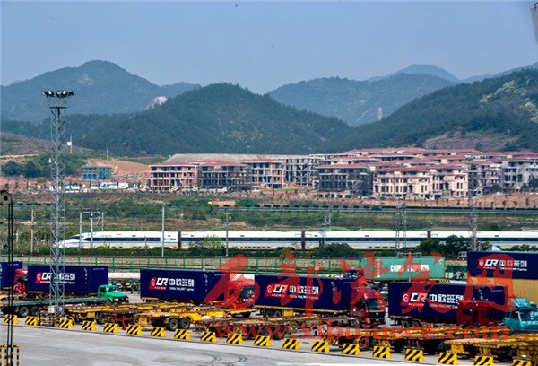 4月15日,浙江義烏西站,集裝箱運(yùn)輸車準(zhǔn)備進(jìn)入鐵路口岸。義烏是享譽(yù)全球的小商品之都。