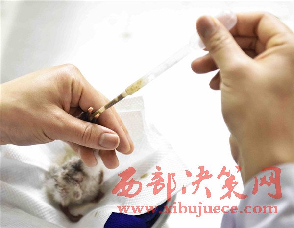 4月19日,工作人員在給朱鹮雛鳥(niǎo)喂食。