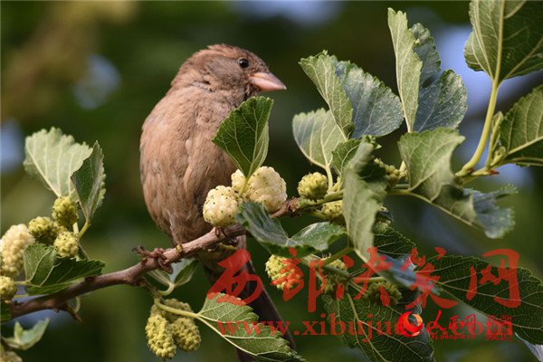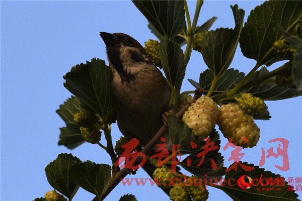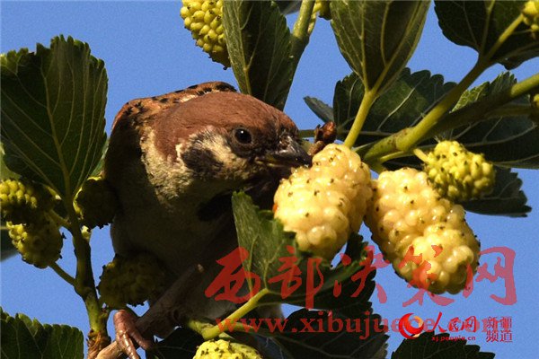 5月25日清晨,在新疆庫爾勒市一家住宅小區(qū),一只麻雀在吃桑葚。每年的5月底是新疆庫爾勒地區(qū)白、紅、黑三色桑葚熟透的季節(jié)。目前,三色桑葚已經在新疆庫爾勒市大量上市,吸引市民爭相購買品嘗。
