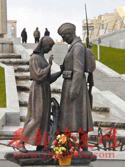 白俄羅斯衛(wèi)國(guó)戰(zhàn)爭(zhēng)歷史博物館入口處,立著一座雕像,背著槍的紅軍戰(zhàn)士正同心愛的姑娘依依惜別,雕像前常年鮮花不斷