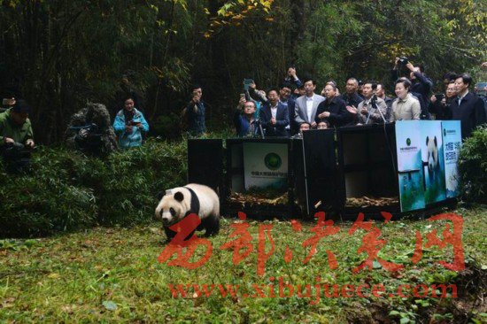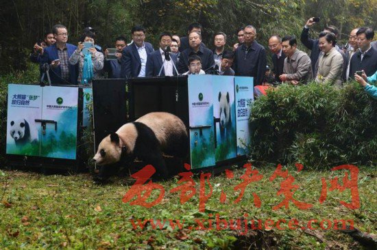 大熊貓“華妍”離開(kāi)運(yùn)輸籠向野外走去