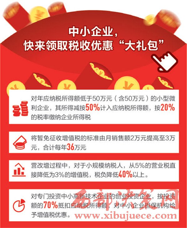 日前國務(wù)院常務(wù)會(huì)議決定,在今年已出臺(tái)4批政策減稅降費(fèi)7180億元的基礎(chǔ)上,繼續(xù)出臺(tái)多項(xiàng)降費(fèi)舉措,預(yù)計(jì)每年可再減輕企業(yè)負(fù)擔(dān)2830億元,合計(jì)全年為企業(yè)減負(fù)超過1萬億元。今年以來,國家持續(xù)推出減稅降費(fèi)措施,讓企業(yè)輕裝上陣,成為推進(jìn)供給側(cè)結(jié)構(gòu)性改革、培育我國競爭新優(yōu)勢(shì)的重要舉措。就在國務(wù)院出臺(tái)多項(xiàng)降費(fèi)舉措的同時(shí),財(cái)政部、國家稅務(wù)總局也發(fā)出通知,將享受所得稅優(yōu)惠政策的小型微利企業(yè)年應(yīng)納稅所得額上限由30萬元提高至50萬元,自2017年1月1日至2019年12月31日,對(duì)年應(yīng)納稅所得額低于50萬元(含50萬元)的小型微利企業(yè),其所得減按50%計(jì)入應(yīng)納稅所得額,按20%的稅率繳納企業(yè)所得稅。