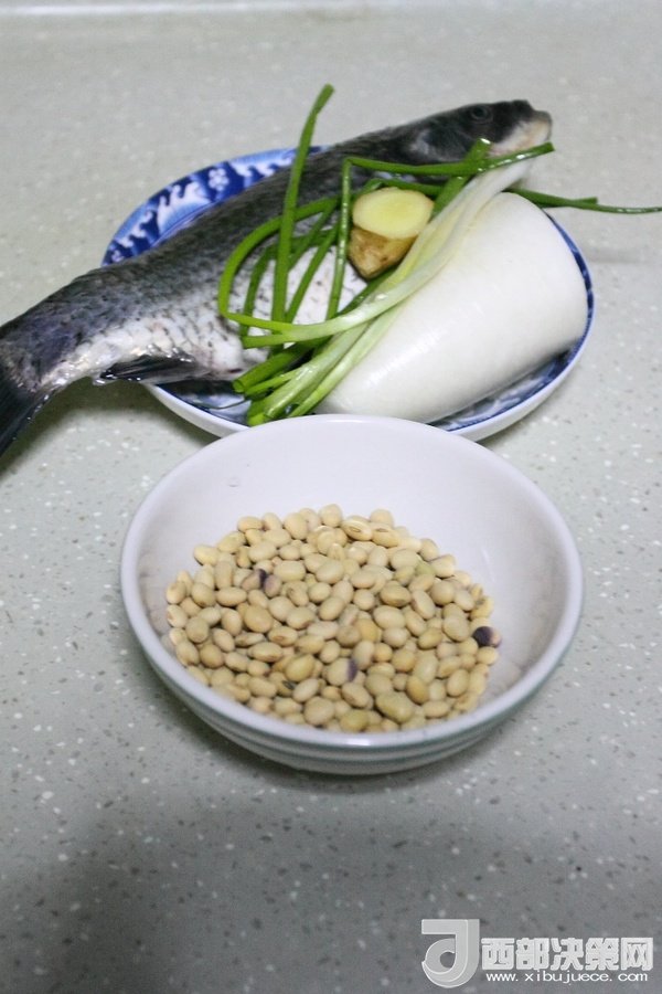 鯽魚1條、白蘿卜半個(gè)、黃豆半杯、香蔥3根、生姜1小塊、油適量、鹽適量、清水適量。