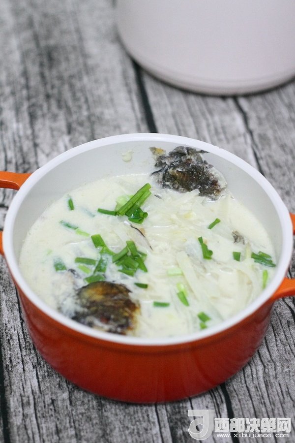 10、加入白蘿卜絲繼續(xù)中小火慢慢燉至湯汁變得更加濃稠和奶白狀態(tài)時(shí)出鍋,出鍋前5分鐘左右加入適量鹽調(diào)味,出鍋后撒上蔥花。