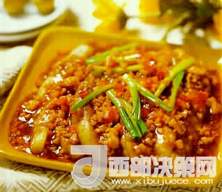 3、鍋內(nèi)留油,下入姜米、肉泥、茄子、雞湯、鹽、味精、白糖、老抽王,用小火燒至汁濃時再用濕生粉勾芡,淋麻油即成。