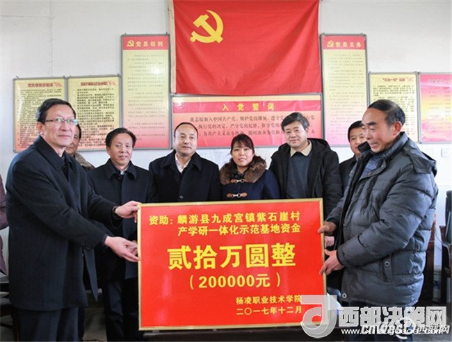 12月15日,為為貫徹落實(shí) 《全省脫貧攻堅(jiān) 2017冬季行動方案》精神,扎實(shí)推進(jìn)高校結(jié)對幫扶“雙百工程”,有效地為當(dāng)?shù)靥厣a(chǎn)業(yè)服務(wù),楊凌職業(yè)技術(shù)學(xué)院黨委書記趙曼、黨委副書記任得元一行來到麟游縣九成宮鎮(zhèn)紫石崖村,為該村捐贈20萬元,用于建立中蜂養(yǎng)殖產(chǎn)學(xué)研一體化示范基地、核桃豐產(chǎn)栽培產(chǎn)學(xué)研一體化示范基地及電商網(wǎng)絡(luò)平臺。