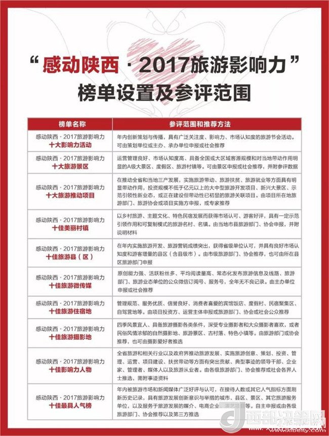 “感動陜西·2017旅游影響力”大型評選活動,既是對2017年陜西旅游業(yè)的綜合評估和優(yōu)勢品牌項目的一次集中梳理和聯(lián)動推廣,評選活動設置了2017年“十大影響力活動”、“十大旅游景區(qū)”、“十大旅游推動力項目”、“十佳美麗村鎮(zhèn)”、“十佳旅游縣(區(qū))”、“十佳旅游微傳媒”、“十佳旅游住宿地”、“十佳旅游攝影地”、“十佳影響力人物”、“十佳最具人氣榜”10類項目,采取社會推薦、自主申報、專業(yè)推選、游客調(diào)查、網(wǎng)民評選、社會公示、大眾點評、數(shù)據(jù)分析等方法得出評選結(jié)果,于2018年1月通過大型盛典對外公布,使其成為載入史冊的2017年度陜西旅游業(yè)優(yōu)勢品牌榜單。
