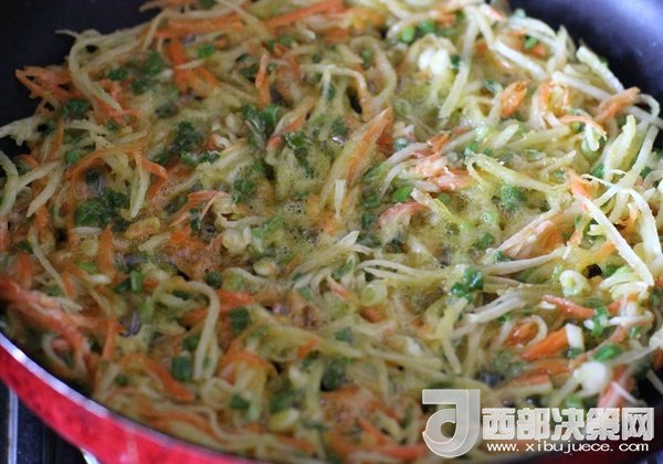土豆絲、胡蘿卜絲、小蔥放一起,加入適量鹽、菜籽油、淀粉,充分拌勻。