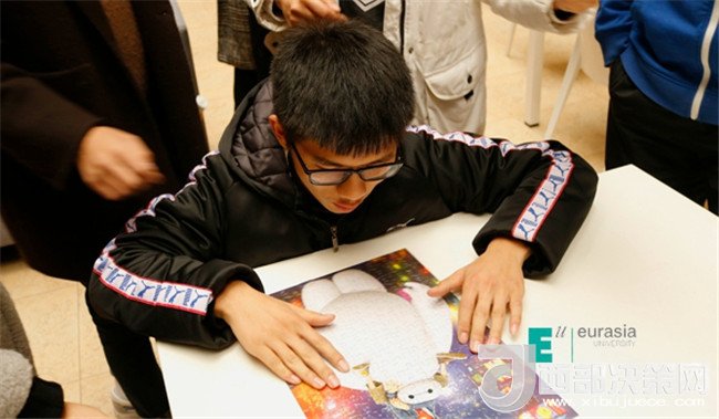 土豆和西紅柿根本就不是一個世界的,但它們走到了一起,變成了薯條和番茄醬它倆就是絕配;學籍制度和競技運動也不是一個世界的,但它們?nèi)诤显诹艘黄?,變成了頭腦風暴和趣味運動它們也可以很般配,現(xiàn)在就讓我們來看看它們是怎么融合的……聽那陣陣氣球爆炸的聲音,他們開始了!在這些綠油油的氣球中有事先設(shè)置的題目隊員們要先擠爆氣球答完題才能得到下一個地方的線索,“補考成績不合格以及成績低于50分必須怎樣?”“本科選修課學分不得低于多少學分?”這些題是不是還要開動腦袋瓜仔仔細細的想想才有答案呢?在比賽的現(xiàn)場一秒都會和對手拉開差距,容不得一絲猶豫拿到線索的隊員們又奔向下一個地點熟悉的教室,這里也不是那么容易通過,看著黑板上的題“冰怎么很快的化成水?”“可替代大學英語四級成績的考試有哪些?”哦,還有計算題,隊員們必須腦洞大開,腦細胞飛速運轉(zhuǎn),做學霸那也是不容易的。只見黑板上粉筆一起一落,答題完畢,看看線索迅速趕往下一地點——地中海。這里指壓板、跳繩早已準備好等著隊員們,學霸不能只管學習身體素質(zhì)也很重要,動起來吧!在指壓板上跳繩,誰想出來的?忍受著腳底的疼痛還要揮動跳繩?太受虐,但是我們是一群不屈不撓的新一代,指壓板上跳繩我們也是鏗鏘有力、一絲不茍。終于結(jié)束痛并快樂著的跳繩環(huán)節(jié),卻看到了整整400塊的拼圖,這個環(huán)節(jié)真是讓人又愛又恨,還記得兒時玩拼圖的快樂,但在這激烈的競爭環(huán)境下,卻是讓人有點心慌和畏懼。隊員們最終齊心協(xié)力戰(zhàn)勝了它,細心、耐心的逐一完好的拼完了每一副圖。