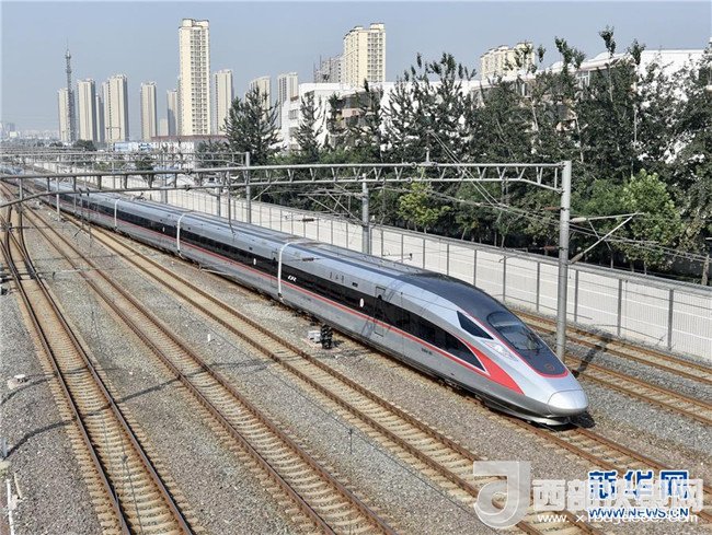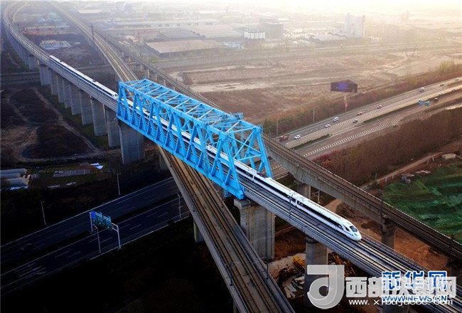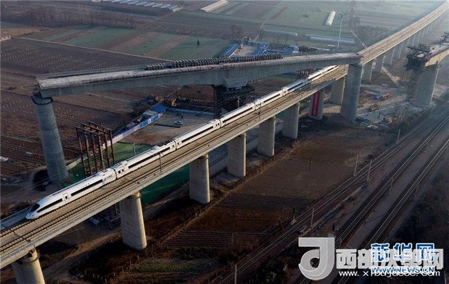 西成高鐵由西安北站駛出的列車經(jīng)過西成高鐵跨西寶高鐵特大橋(12月6日攝)。12月6日,西安至成都高速鐵路全線開通運(yùn)營,兩地的最短旅行時間壓縮至4小時7分。
