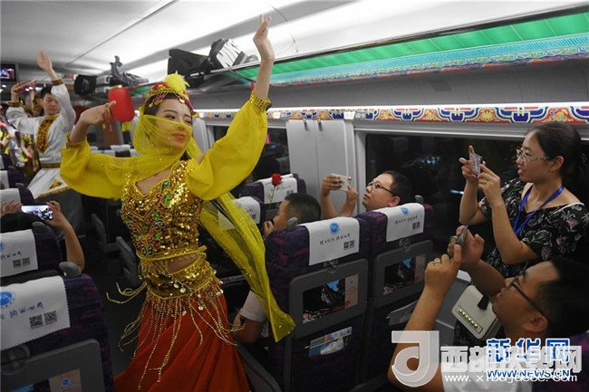 蘭州客運(yùn)段列車員在蘭州鐵路局開行的首趟寶蘭高鐵G2028次動車組上為旅客表演節(jié)目(7月9日攝)。7月9日,寶雞至蘭州高鐵正式開通運(yùn)營,西北的甘肅、青海、新疆由此融入全國高鐵大家庭。