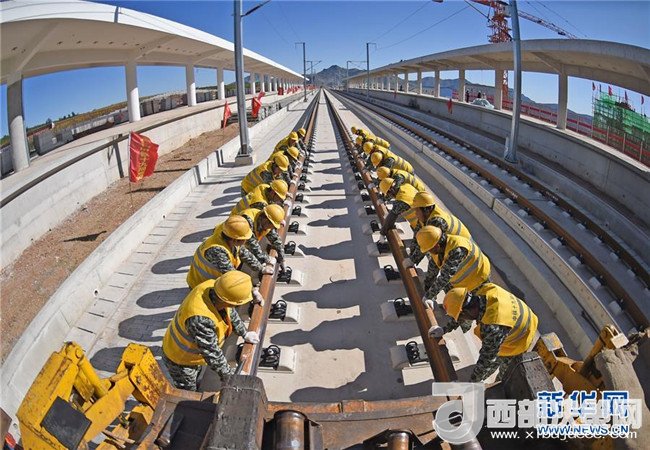 中鐵十九局工程人員在京沈高鐵凌源南站進(jìn)行鋪軌作業(yè)(9月28日攝)。京沈高鐵起自北京星火站,經(jīng)河北省承德市、遼寧省朝陽市、阜新市接入沈陽站,線路全長698公里,設(shè)計時速350公里。