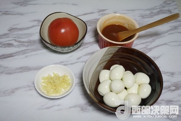 鵪鶉蛋15個(gè)、番茄1個(gè)、番茄醬3大勺、蒜蓉適量、食用油、鹽、糖。