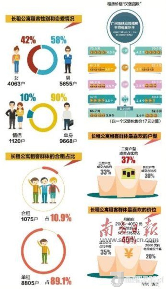 那么,對廣州這座全國主要的一線城市來說,目前的住房租賃市場和租房的情況與其他城市有何不同呢?最近,南方日報、南方+聯(lián)合萬科泊寓、廣州中原地產等企業(yè)機構,在“租房時代”南方號向廣大網友和住房租賃行業(yè)人士推出了“廣州地鐵沿線住房平均租金漢堡指數”、“長租公寓租房群體畫像”等系列大數據分析產品。