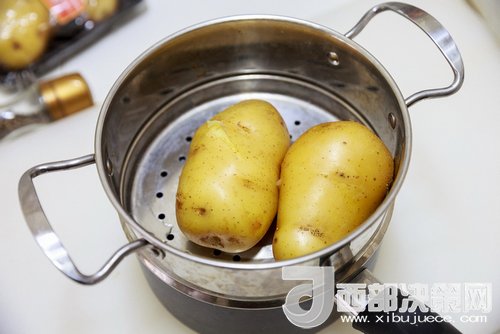 土豆放進入蒸鍋蒸熟(用筷子能輕松插入的程度),晾涼后剝?nèi)テぁ?/p>