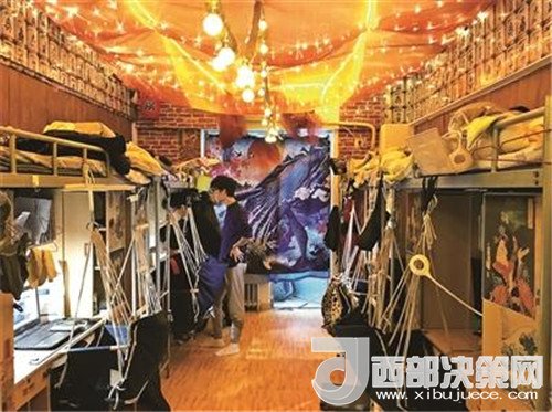 12月28日,劉清帶著記者來到中國傳媒大學生活區(qū),走進他們改造后的宿舍。宿舍位于6層,記者進去時,劉清的兩位室友正坐在自己的吊椅上打游戲。與其他的宿舍不同,這間宿舍的墻壁上貼滿了壁紙,天花板上布滿了一串串LED小燈泡。四人告訴北青報記者,他們從來不開宿舍原來配置的日光燈,都是用LED燈照明。記者注意到,這些小燈上面,罩著一層紫紅色紗幔。