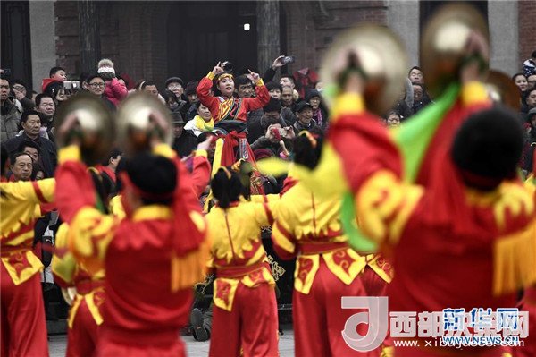 1月1日,在臺(tái)兒莊古城復(fù)興廣場(chǎng),民間藝人在表演威風(fēng)鑼鼓。(記者 郭緒雷 攝)
