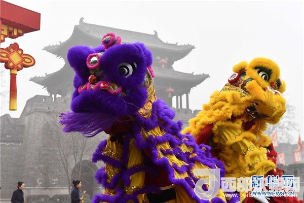 1月1日,在臺(tái)兒莊古城開福門儀式上,民間藝人在表演舞獅。(記者 郭緒雷 攝)