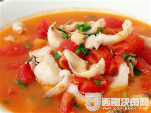8、煮番茄魚骨這邊也關(guān)火,加少許鹽和雞精調(diào)味,把魚骨挑出扔掉,番茄和湯裝入盛器,把剛才滑熟的魚片放在面上,撒香菜上桌,可以開動(dòng)了。