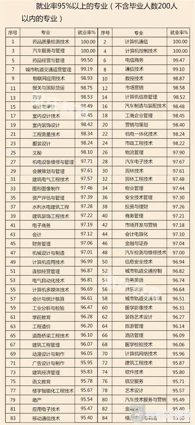 即將畢業(yè),你找到中意的工作了沒?近日,重慶市教委發(fā)布《重慶市2017屆普通高校畢業(yè)生就業(yè)情況報告》。據(jù)統(tǒng)計,2017年,全市共有普通高校畢業(yè)生約21.49萬人,截至2017年8月31日,我市2017屆普通高校畢業(yè)生就業(yè)率為89.65%,與2016屆同比上升0.56%。記者了解到,控制工程專業(yè)、藥品質(zhì)量檢測技術(shù)、汽車服務(wù)與管理等專業(yè),其就業(yè)率達100%。哪個專業(yè)就業(yè)前景“低調(diào)卻奢華”?哪個專業(yè)只是“看上去很美”?趕緊往下看吧!