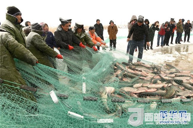 寒冬時(shí)節(jié),內(nèi)蒙古巴彥淖爾市杭錦后旗鴻雁湖進(jìn)入冬季捕魚(yú)季,湖面上呈現(xiàn)出一派“人歡魚(yú)躍”的豐收景象。