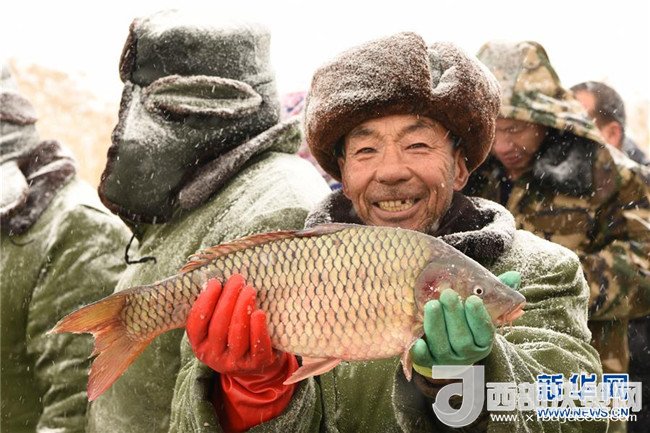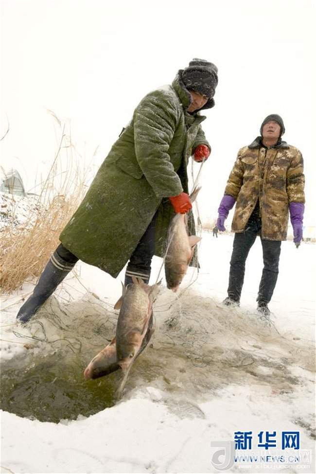 1月6日,在內(nèi)蒙古杭錦后旗鴻雁湖,捕魚(yú)人展示捕撈上來(lái)的魚(yú)。(支茂盛 攝)
