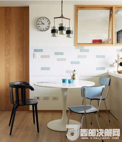 餐區(qū)裝飾十分簡單,一張白色小圓桌,幾把藍(lán)色和黑色的餐椅,就成了房主人每天就餐的地方。