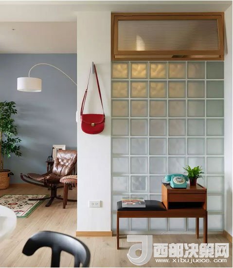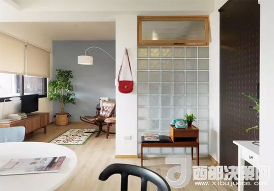 客廳的前方是隔開的陽臺(tái),背面則是衛(wèi)浴室,一處墻面用玻璃磚代替,增加了衛(wèi)浴室的采光,和白色墻面比起來更顯通透。