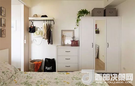 藤筐、收納箱、掛衣桿、衣柜,各種收納工具一應(yīng)俱全,搭配得十分得宜。衣柜中間柜門上安裝了全身鏡。對于不愿把鏡子放進(jìn)臥室的房友們來說,不知道這樣子布置會(huì)不會(huì)稍好一些。