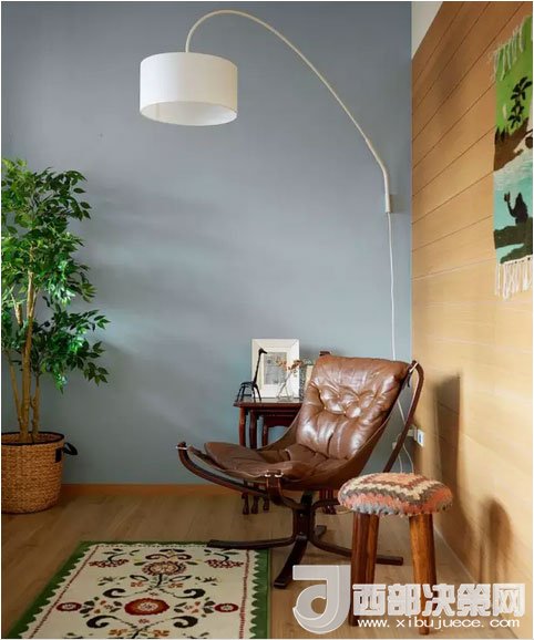 客廳的仿古沙發(fā)椅看著就很舒服。淡藍(lán)色的墻面襯托出白色釣魚燈優(yōu)美的線條。夜深燈亮,這里肯定是最溫馨的角落。