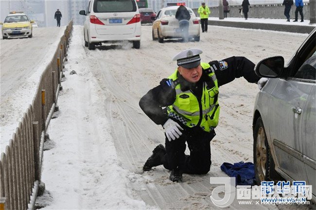 1月27日,在湖北省武漢市江漢一橋橋面,民警將衣服鋪墊在雪地上協(xié)助推車(chē)。(金思柳 攝)